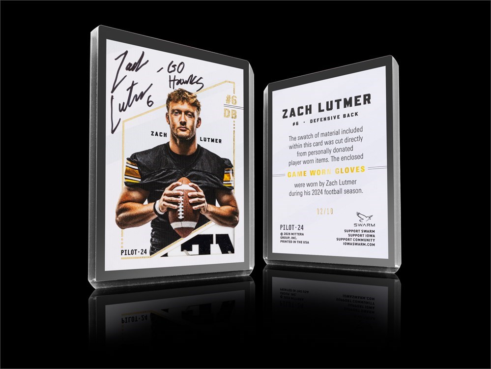 Bid now on this limited-edition ZACH LUTMER collector card! Each individual card has been personally signed by Zach Lutmer himself. A swatch of material is enclosed within each card that was cut directly from a pair of GAME WORN GLOVES worn during the Iowa Hawkeyes 2024 football season and personally donated by Zach Lutmer. Each card has been foil stamped with its particular serial number that falls within this set of 10 total cards.
