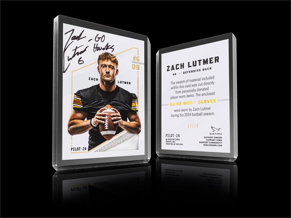 Bid now on this limited-edition ZACH LUTMER collector card! Each individual card has been personally signed by Zach Lutmer himself. A swatch of material is enclosed within each card that was cut directly from a pair of GAME WORN GLOVES worn during the Iowa Hawkeyes 2024 football season and personally donated by Zach Lutmer. Each card has been foil stamped with its particular serial number that falls within this set of 10 total cards.