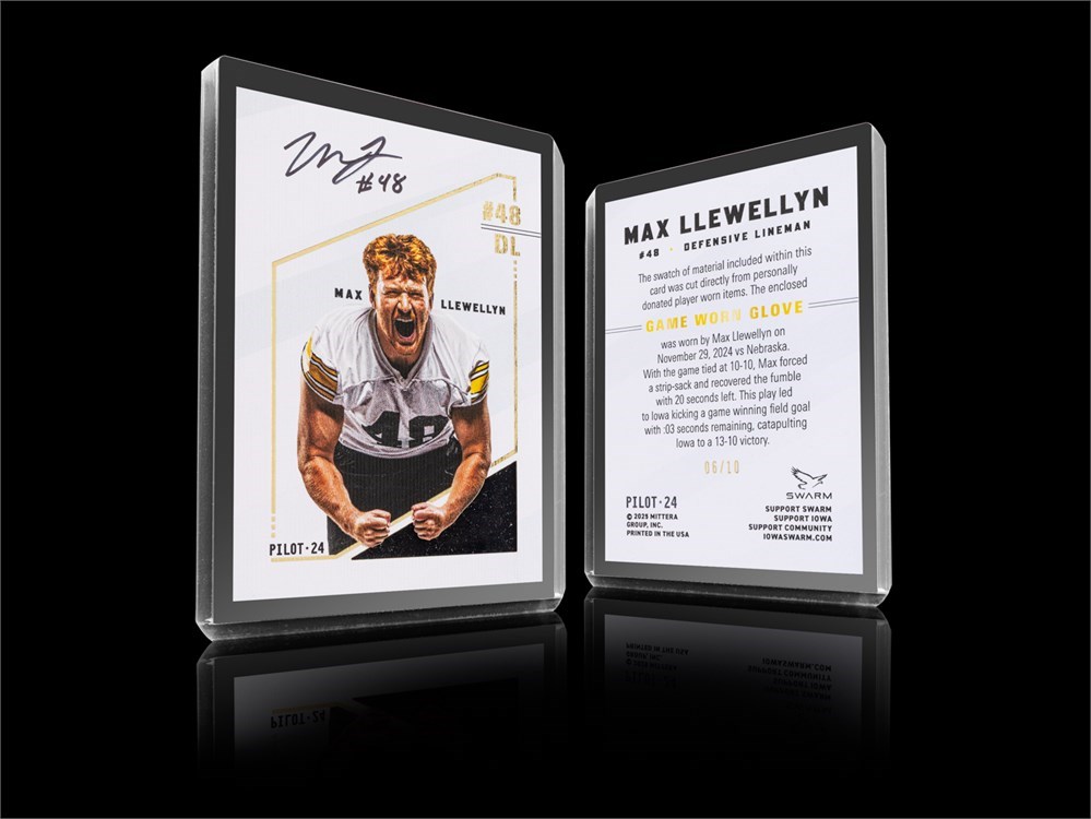 Bid now on this limited-edition MAX LLEWELLYN collector card! Each individual card has been personally signed by Max Llewellyn himself. A swatch of material is enclosed within each card that was cut directly from his GAME WORN GLOVES worn on November 29, 2024 vs Nebraska, and personally donated by Max Llewellyn. With the game tied at 10-10, Max forced a strip-sack and recovered the fumble with 20 seconds left. This play led to Iowa kicking a game winning field goal with :03 seconds remaining, catapulting Iowa to a 13-10 victory! Each card has been foil stamped with its particular serial number that falls within this set of 10 total cards.