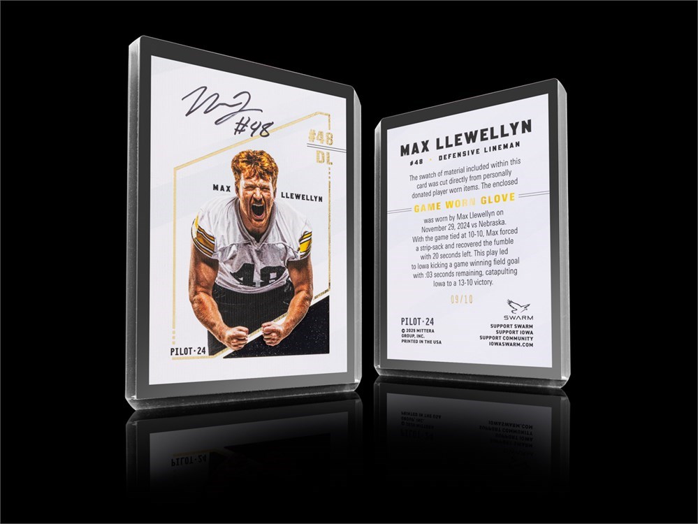 Bid now on this limited-edition MAX LLEWELLYN collector card! Each individual card has been personally signed by Max Llewellyn himself. A swatch of material is enclosed within each card that was cut directly from his GAME WORN GLOVES worn on November 29, 2024 vs Nebraska, and personally donated by Max Llewellyn. With the game tied at 10-10, Max forced a strip-sack and recovered the fumble with 20 seconds left. This play led to Iowa kicking a game winning field goal with :03 seconds remaining, catapulting Iowa to a 13-10 victory! Each card has been foil stamped with its particular serial number that falls within this set of 10 total cards.
