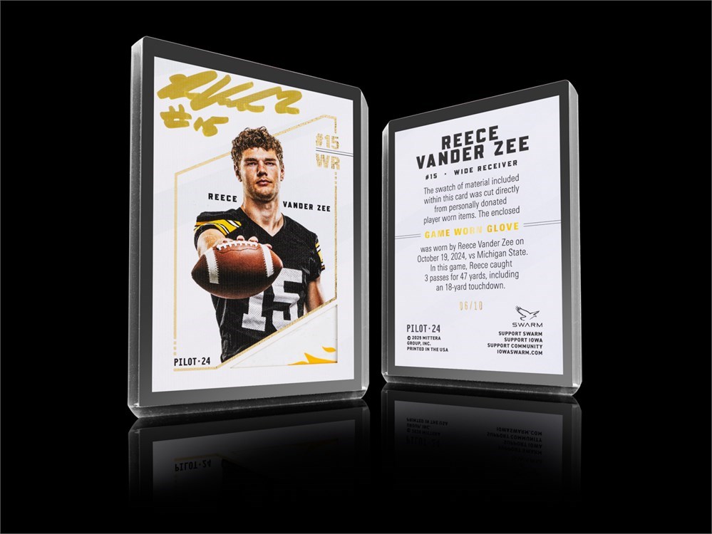 Bid now on this limited-edition REECE VANDER ZEE collector card! Each individual card has been personally signed by Reece Vander Zee himself. A swatch of material is enclosed within each card that was cut directly from a GAME WORN GLOVES that were worn on October 19, 2024, vs Michigan State and personally donated by Reece Vander Zee. In this game, Reece caught 3 passes for 47 yards, including an 18-yard touchdown. Each card has been foil stamped with its particular serial number that falls within this set of 10 total cards.