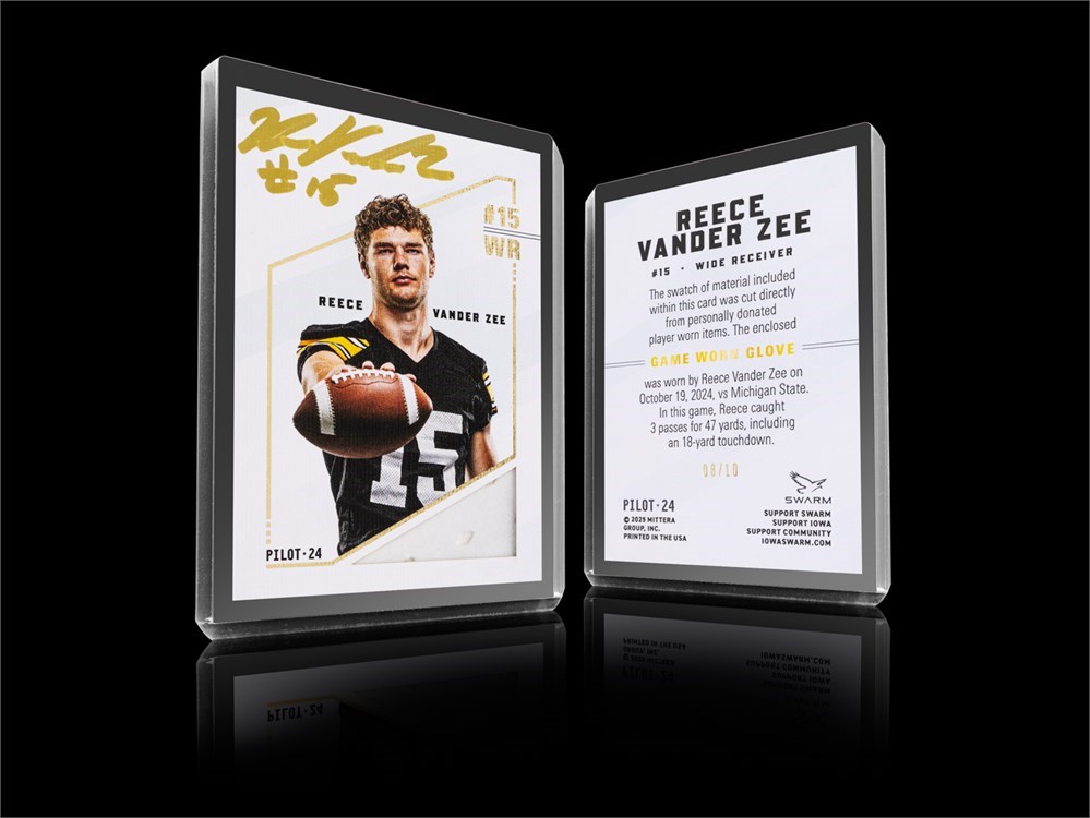 Bid now on this limited-edition REECE VANDER ZEE collector card! Each individual card has been personally signed by Reece Vander Zee himself. A swatch of material is enclosed within each card that was cut directly from a GAME WORN GLOVES that were worn on October 19, 2024, vs Michigan State and personally donated by Reece Vander Zee. In this game, Reece caught 3 passes for 47 yards, including an 18-yard touchdown. Each card has been foil stamped with its particular serial number that falls within this set of 10 total cards.