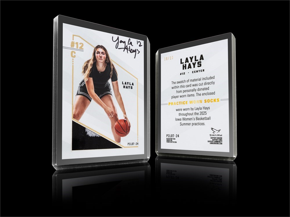 Bid now on this limited-edition LAYLA HAYS collector card! Each individual card has been personally signed by Layla Hays herself. A swatch of material is enclosed within each card that was cut directly from her PRACTICE WORN SOCKS that were worn by Layla Hays throughout the 2025 Iowa Women's Basketball Summer Practices. Each card has been foil stamped with its particular serial number that falls within this set of 10 total cards.