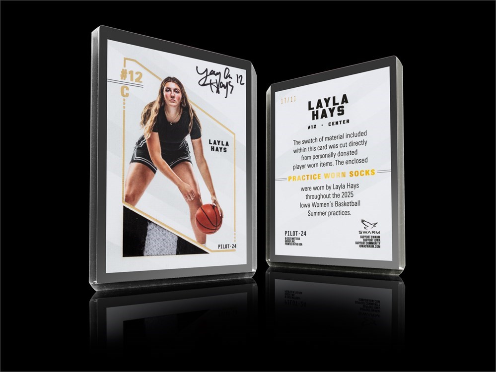 Bid now on this limited-edition LAYLA HAYS collector card! Each individual card has been personally signed by Layla Hays herself. A swatch of material is enclosed within each card that was cut directly from her PRACTICE WORN SOCKS that were worn by Layla Hays throughout the 2025 Iowa Women's Basketball Summer Practices. Each card has been foil stamped with its particular serial number that falls within this set of 10 total cards.