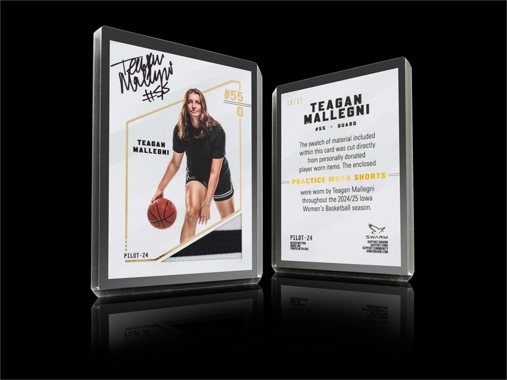 Bid now on this limited-edition TEAGAN MALLEGNI collector card! Each individual card has been personally signed by Teagan Mallegni herself. A swatch of material is enclosed within each card that was cut directly from her PRACTICE WORN SHORTS that were worn by Teagan Mallegni throughout the 2024/25 Iowa Women's Basketball season. Each card has been foil stamped with its particular serial number that falls within this set of 10 total cards.