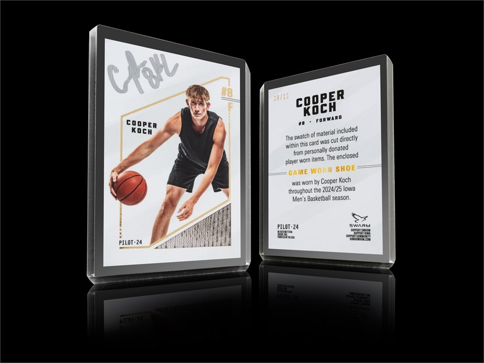 Bid now on this limited-edition COOPER KOCH collector card! Each individual card has been personally signed by Cooper Koch himself. A swatch of material is enclosed within each card that was cut directly from his GAME WORN SHOES that were worn by Cooper Koch throughout the 2024/25 Iowa Men's Basketball season. Each card has been foil stamped with its particular serial number that falls within this set of 10 total cards.
